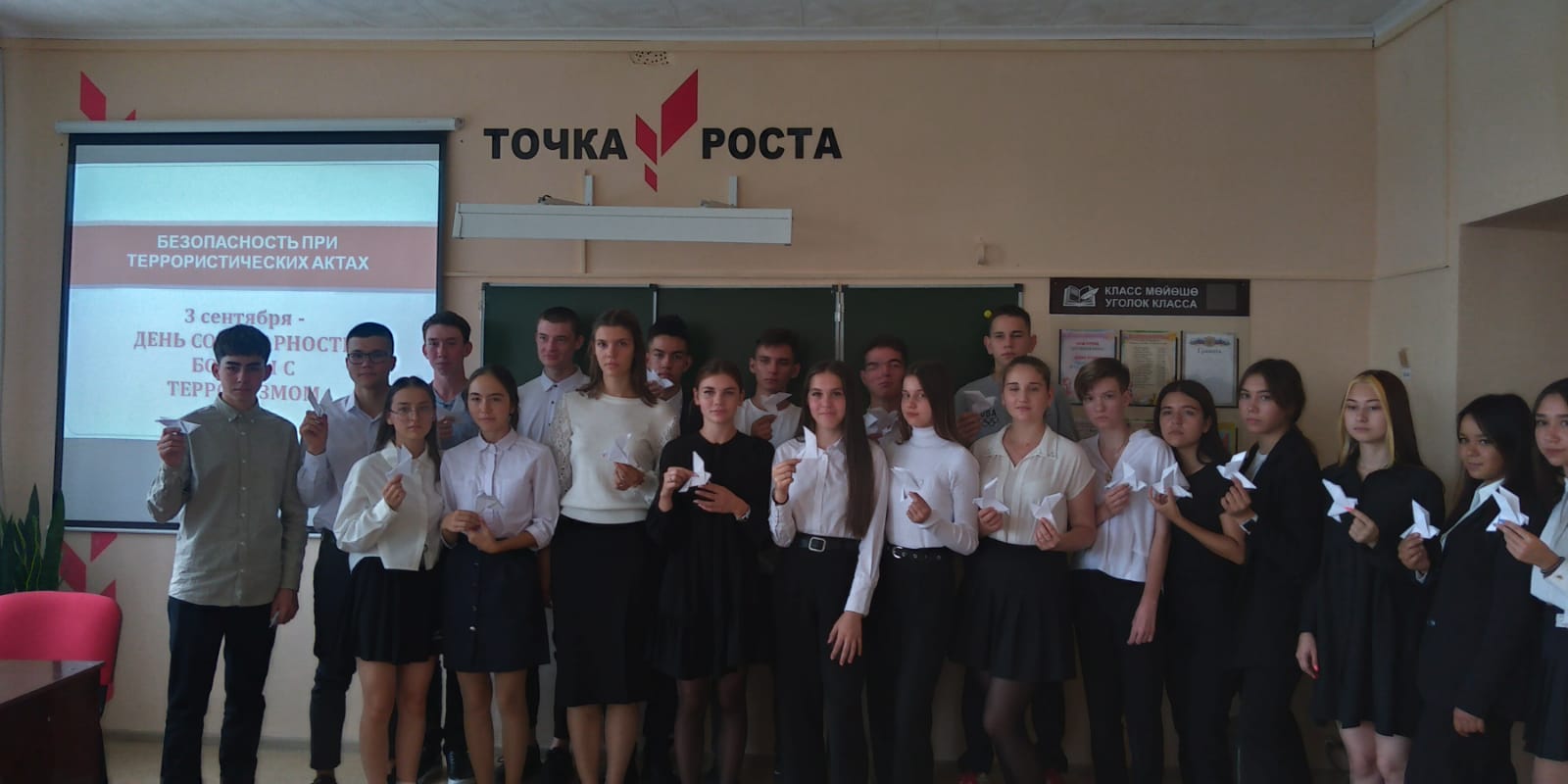 В рамках Дня солидарности борьбы с терроризмом в МБОУ гимназия с. Раевский для обучающихся 11 классов был проведен классный час, в ходе которого ребята узнали о самых громких терактах в нашей стране: о трагедии в Беслане, Москве и Волгодонске. На уроке ребята также узнали о том, как нужно себя вести, если оказались в заложниках у террористов, при штурме, проведении контртеррористических операций, если обнаружили подозрительный предмет в общественном месте, оказавшись под завалом на месте взрыва. В конце мероприятия обучающиеся присоединились к акции «Голубь – символ мира», изготовив из бумаги белых голубей, тем самым почтив память жертв террора.