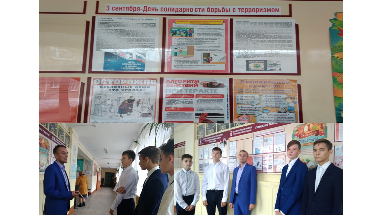 В МБОУ гимназия с. Раевский в этот день был оформлен информационный стенд, на котором обучающиеся могут узнать информацию о правилах безопасного поведения в случае угрозы терракта, алгоритм действий при обнаружении бесхозных предметов, телефоны служб, занимающихся предотвращением и пресечением актов террора на территории Российской Федерации. Также в этот день с обучающимися проводились беседы, в ходе которых они узнали о самых громких террактах в нашей стране, о том, как нужно себя вести, если обнаружил подозрительный предмет в общественном месте.