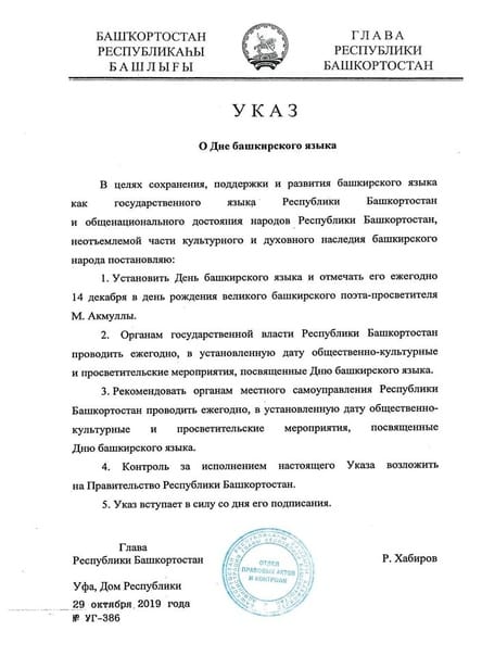 Башҡортостан Башлығы Указына ярашлы, 14 декабрҙә республикала Башҡорт теле көнө билдәләнә. Уның сиктәрендә бөтә республика буйынса башҡорт телен популярлаштырыу, һаҡлау һәм үҫтереүгә йүнәлтелгән саралар ойошторола.